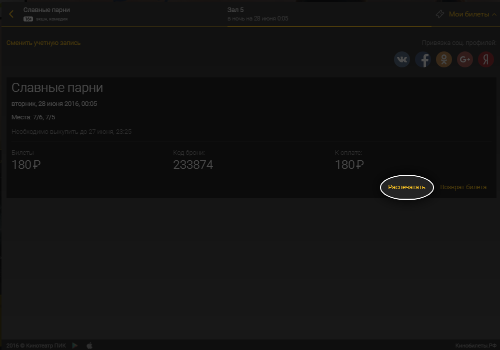 Бронь нужно выкупить за 20 минут до начала фильма, в противном случае она автоматически снимается